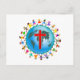 Cute illustration of a group of diverse little boys and girls holding hands around a globe of the world and a red cross representing faith in Christ. Easily customise and choose your own background colour. Image available on various gifts and products.