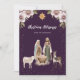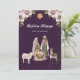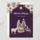 Elegant purple Christian Christmas card featuring a scene with Mary, Joseph and the infant Jesus Christ in the manger in Bethlehem.