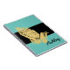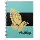 Big, Bold & beautiful. This notebook has a very large image of praying hands in Gold-tone atop a Black accent strip. Notebook shown in Aqua. Your custom name in large text (shown in a script) on lower front corner. Custom this to your own personalised notebook.