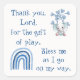 Monogrammed for you to insert your own prayer if you so choose, square sticker. This cute boho theme with a blue rainbow and elephant, and blue text on a white background, states, Thank you, Lord, for the gift of play. Bless me as I go on my way.