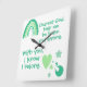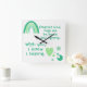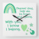 Monogrammed for you to insert your own prayer if you so choose, square wall clock. This cute boho theme with a green rainbow and galaxy, and green text on a white background, states, Dear God, help me be brave and strong. With you, I know I belong.