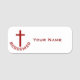 A simple and striking text design for Christians that features a large red cross in the centre and the word: Redeemed in a bold red stamped look font curved up under the cross. Choose your favourite background colour. This name tag is perfect for church conferences and events.