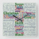 This religious word art / subway art design features words associated with Christianity arranged into the shape of a cross. Words include: God, Jesus, Christian, Bible, faith, love, peace, kindness, salvation, spiritual, Commandments, righteous, compassion, scripture, disciples, Christ, lamb, good, hope, truth, pray, Heaven, savior, worship, passion, gospel, charity, pure, holy, joy, Lord, verse, church, miracle, belief, bless, grace, glory, will, spirit, angels, trinity, and cross.
