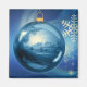 Graphic with a blue christmas ball, decorated with a winter landscape