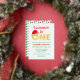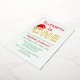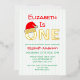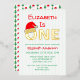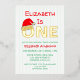 Christmas first birthday with subtle stripes. Back of the invitation is a pattern of Christmas trees and santa hats