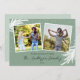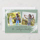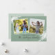This 2 photo Christmas card is accented with evergreen branches appearing in white. The soft green background features subtle white snow.