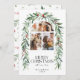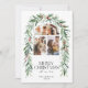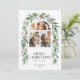 Christmas Photo Collage Botanical Holiday Card. Beautiful Christmas card featuring an arch with 3 photos paired with real hand painted watercolor red berries and winter greenery arch wreath. Leaves and berries botanical Christmas pattern in the back of the invitation.