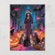 A beautiful woman in a santa hat with cats and bats and festive jack-o-lanterns fantasy art