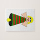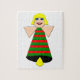 This awesome puzzle features a pretty Christmas Angel with blonde hair, blue eyes and a big smile. Her body is a festive green and red coloured bell with a yellow clapper at the bottom.