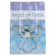 This is holiday graphic art of the filigree Christmas Angel of Faith in hues of blue and gold. There are gemstones on her halo and skirt, she is holding a cross with the word, "Faith", and her head is a blue gemstone. The angel is printed on the front and back over a blue-ombre background covered with snowflakes. The text on the white ribbon printed around the top can optionally be changed or removed.