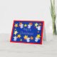 A bright and festive Christmas card with six little white angels polishing the stars in readiness for Christmas, from a handpainted paper collage design by Judy Adamson. The greeting on the front, in white lettering on a deep blue background, is 'Happy Christmas' and the inside is left blank for your own message.