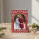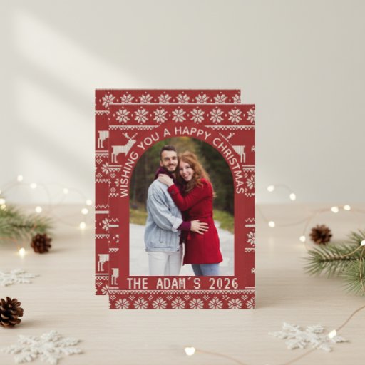 Celebrate the Christmas in style with this modern and on-trend card design. It features an elegant arch-shaped photo frame, curved contemporary typography, and beautifully hand-drawn winter foliage accents—creating a fresh and stylish look for your 2026 Christmas greetings. Background inspired by traditional Scandinavian sweater motifs, this design features charming reindeer, snowflakes, and geometric knit rows for a warm and festive winter aesthetic.