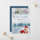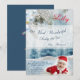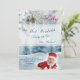 Our Christmas Baby Has Arrived card - A winter scene background with snow in the colours teal -green light blue and bright red Santa heads on a baby