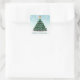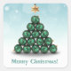 Merry Christmas illustration featuring green with gold glitter Christmas balls stacked in a Christmas tree shape and a golden star topper on top in front of a festive light blue bokeh background.