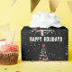 Happy Holidays white Christmas tree in snowflakes with red socks and baseball ornaments on black background.