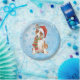 Celebrate the holiday season with a cute Basenji puppy wearing a Santa hat and scarf surrounded by snowflakes and with the words, Happy Howlidays!