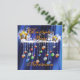 A busy design with snowflakes, baubles and gold stars against a blue background.