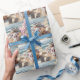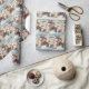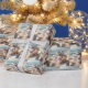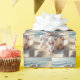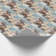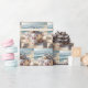 A beautifully wrapped gift adorned with starfish patterns sits in the golden sands of a beach, with gentle ocean waves lapping in the background