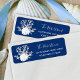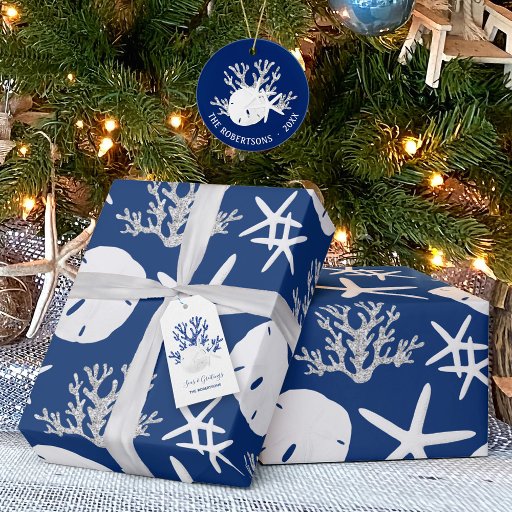 These navy blue Christmas beach return address labels feature silver glitter coral, sand dollar and starfish.