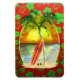 Happy Holidays from the warm sandy beaches of your favourite tropical island beach. Palm tree decorated with Christmas ornaments and lights, with a retro surfboard leaning against the Christmas tree in front a sunset over the ocean. Red and green holiday colour background of Hawaiian Honu sea turtles and hibiscus flowers.
