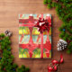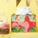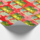 Happy Holidays from the warm sandy beaches of your favourite tropical island beach. Palm tree decorated with Christmas ornaments and lights, with a retro surfboard leaning against the Christmas tree in front a sunset over the ocean. Red holiday colour background of Hawaiian Honu sea turtles and hibiscus flowers.