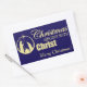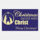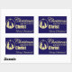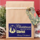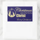 The feature on this faith themed sticker is a simple silhouette nativity scene inside a circle with the Star of Bethlehem above, and the stylised text that says "Christmas Begins With Christ". Everything is bright gold, and placed on a dark blue background.