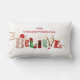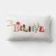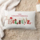 Christmas BELIEVE Family Name Nostalgic Icons Lumbar Pillow. Show your Christmas spirit with this personalised decorator pillow featuring BELIEVE in a festive and whimsical creative typography filled with traditional Christmas icons like Santa, elves and reindeer components and family name on one side and just the title BELIEVE on the other. ASSISTANCE: For help with design modification, transferring the design to another pillow type or another product or if you would like coordinating items, contact the designer BEFORE ORDERING via the Zazzle Chat MESSAGE tab below or email makeitaboutyoustore@gmail.com.