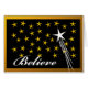 Christmas greeting card with a large white star surrounded by smaller yellow stars. Framed in a gold metallic colour. The word Believe is written in white and script text. Message inside refers to reaching for the stars and believing in the spirit of the season. Bold and graphic design. Art, image, and verse copyright © Shoaff Ballanger Studios.