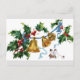 vintage art with gold bells and christmas holly with red berries and snow man family.