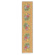 Christmas table runner with big vibrant bells in red, blue, gold on holly and berries with a gold and snowflake background.