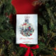 Christmas ornament bade of holiday berries, pinecones, and a Bulfinch on a snowy background with a red Merry Christmas typography.