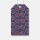 These gift tags for Christmas have a pattern of red bicycles with candy cane stripes on the frame set against a dark blue background. Add your text.