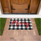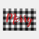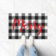 Red "merry" text in a calligraphy font style with Santa Claus hat on black and white buffalo plaid.