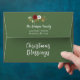 Christmas Blessings green envelope depicts an elegant winter floral with a simple red and white rose, berries and greenery. It features a printed return address on the back top.
