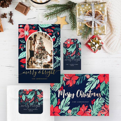 Celebrate the season with our Christmas Blue Botanical Floral Gold Foil Holiday Card, featuring an elegant floral pattern. Adorned with festive red and green botanical elements, this card captures the holiday spirit and is perfect for sending warm wishes to friends and family.
