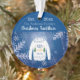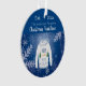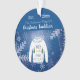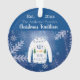 A blue background with large white snowflakes, crystals. Decorated with an ugly white xmas sweater. Personalise and add your family name, year and a title. The text: Christmas Tradition is written in white with a modern hand lettered style script. An ornament as a keepsake for your first Christmas as a family.