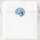 Christmas bright blue round sticker Penguin skating and other Snowfolk.