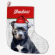 So sweet, this two-sided Christmas stocking has a watercolor illustration of a holiday dressed Bluenose Pit Bull dog and your pup's name on both sides with a woof word art background.