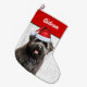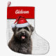 So sweet, this two-sided Christmas stocking has a watercolor illustration of a holiday dressed Bouvier des Flandres and your pup's name on both sides with a woof word art background.