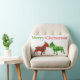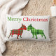 Red and green plaid bully dogs nose to nose on a cheerful pillow. Solid red on reverse.