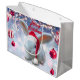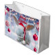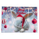 Bunny in a Santa hat surrounded by Christmas ornaments and a snowy scene.