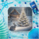 A snowy scene features a quaint wooden barn adorned with holiday lights and a lit Christmas tree stands nearby with a rabbit in the foreground