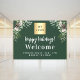 Emerald green background, white text. Personalise and add your logo. Text: Happy Holidays! and Welcome. Decorated with pine sprigs and cones.