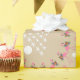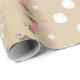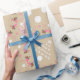 Coastal Christmas wrapping paper on a roll. Quality, heavy duty gift wrap has a unique design with flamingos, sand dollars and starfish printed on a sand tan colour background. Christmas tree images are made of white starfish with a sand dollar base. Pink flamingos wearing festive holiday wreaths encircle white starfish trees with sand dollar base.