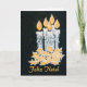 A chic Christmas Card with the greeting in Portuguese and five candles with holly, hand-painted in gold and silver paint on a starry black background.