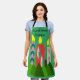 This apron has a Christmas design of candles made of rectangles decorated with stars, ovals, or diamonds with trees grouped around the bottom.