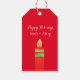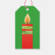 Christmas candle cut painted paper art gift tag on a red and green background. Personalise with your own words, name or message on reverse currently reads Happy Holiday. Ideal for your Christmas religious or candle gifts. Design by Sarah Trett.