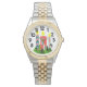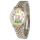 This men's watch has a Christmas design of candles made of rectangles decorated with stars, ovals, or diamonds with trees grouped around the bottom.