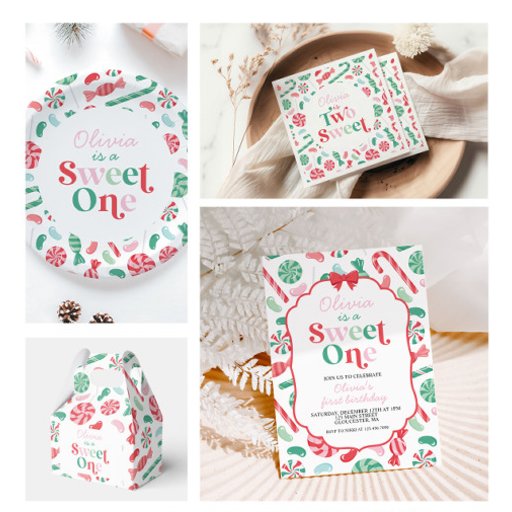 Sweet One! Christmas Candy Sweet One first birthday party invitation with candy canes, jelly beans and other candy.