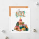 A warming heart card for Christmas greetings with cute animals and a mountain of presents.